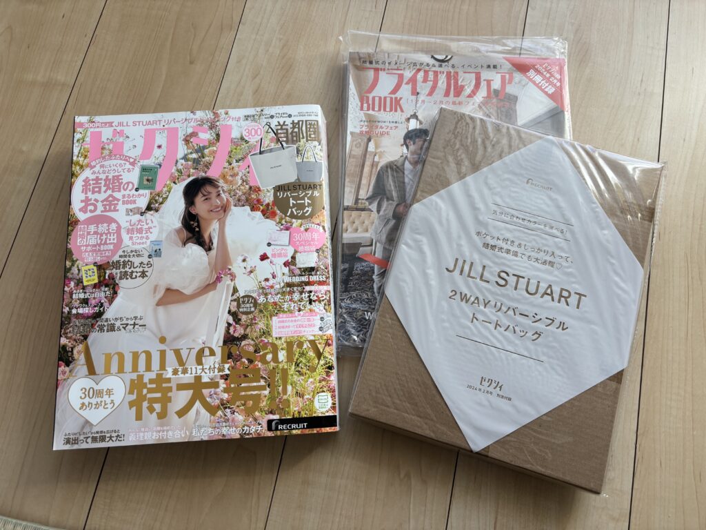 | 2024年2月号 | ・結婚のお金まるわかりBOOK ・婚約したらまず読む本 ・結婚の手続き・届け出サポートBOOK | ・ふたりの“したい結婚式”が見つかるSheet ・ピンクの婚姻届 ・ハレの日を彩る 祝福フラワー婚姻届 ・結婚準備ダンドリシート&結婚決まってすぐやることシート ・相場一覧&ゼクシィアプリ診断シート | ・ブライダルフェアBOOK ・婚約指輪&結婚指輪BOOK | JILL STUART 2WAYリバーシブルトートバッグ |