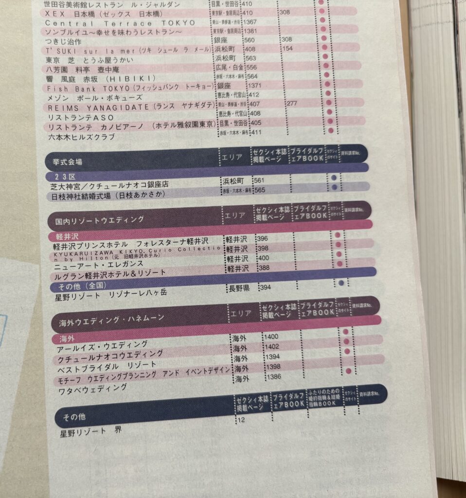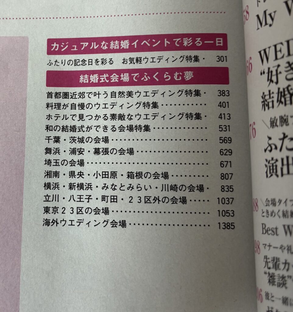 「国内リゾートウエディング」「海外ウエディング・ハネムーン」もそんなにたくさん載ってるわけじゃない。ていうか首都圏版だからいらない。