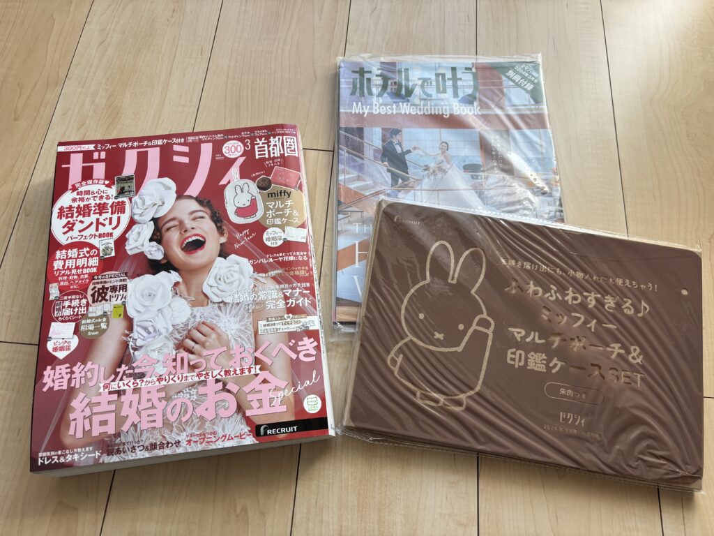 | 2024年3月号 | ・時間も心も“よゆ~”で進めよう 結婚準備ダンドリBOOK ・結婚式の費用明細BOOK ・僕らのゼクシィ | ・かわいすぎる♪ミッフィー婚姻届 ・ピンクの婚姻届 ・結婚の手続き届け出らくらくシート ・相場一覧&ゼクシィアプリ診断シート ・会場見学チェックシート | ・ブライダルフェアBOOK ・ホテルウェディングBOOK ・国内リゾート&海外ウェディングBOOK | ふわふわすぎる♪ ミッフィーマルチポーチ&印鑑ケースSET |