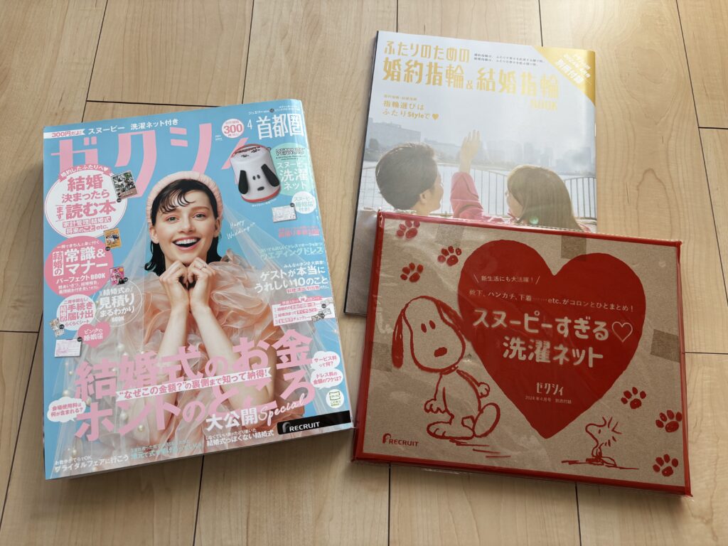 | 2024年4月号 | ・結婚決まったらまず読む本 ・結婚の常識&マナー PERFECT ANSWER BOOK ・結婚式の見積り まるわかりBOOK | ・スヌーピー婚姻届 ・ピンクの婚姻届 ・結婚の手続き届け出らくらくシート ・会場見学チェックシート ・相場一覧&ゼクシィアプリ診断シート | ・婚約指輪&結婚指輪BOOK | スヌーピーすぎる♪洗濯ネット |