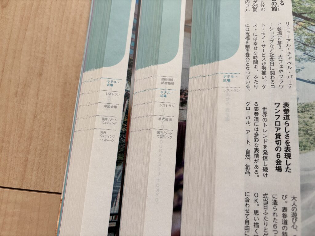 前半300ページは特集記事(合間に広告含む)で、そのあとほぼ巻末まで約1,100ページにわたって式場カタログ記事が占めます。