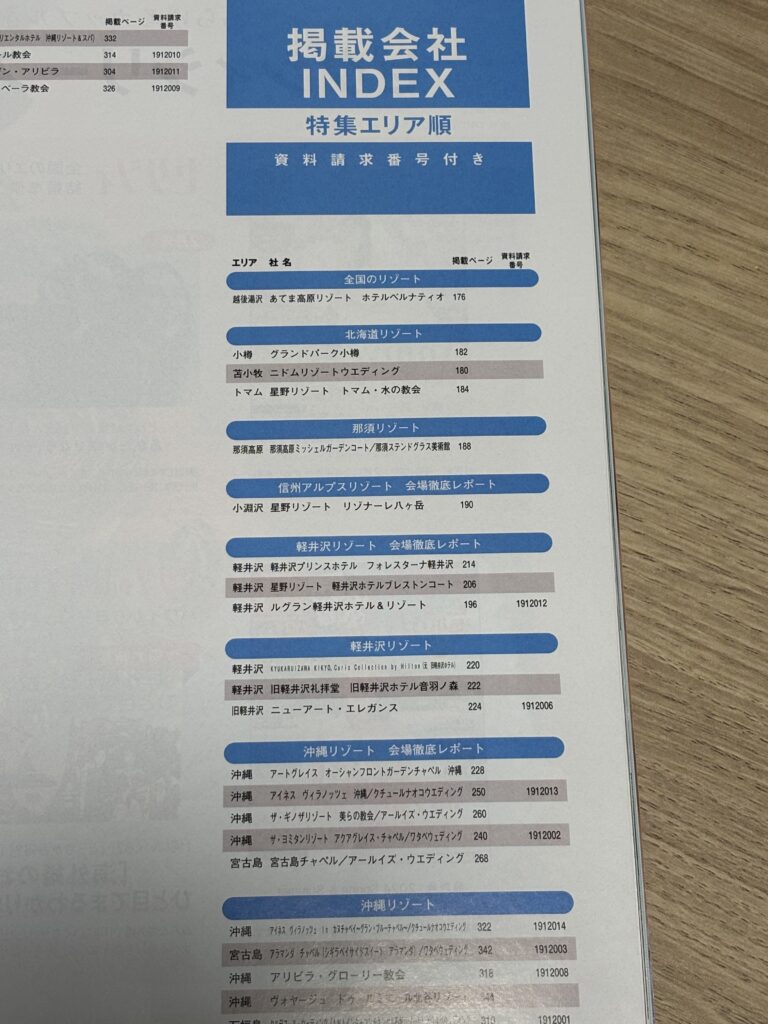 後半の式場カタログページは、北海道・那須・信州アルプス・軽井沢・沖縄とエリア分けされていますが、