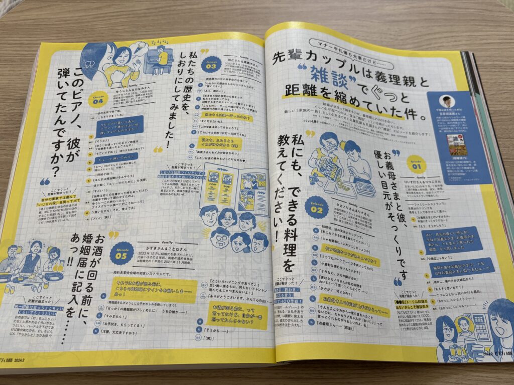 テーマごとに実際に結婚式を挙げたカップルの体験談を取り上げ、紹介していく構成が多いです。